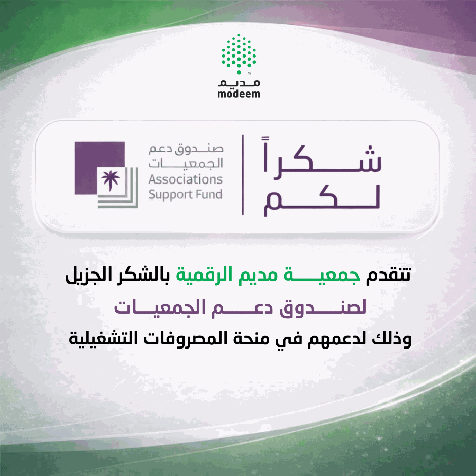 تتقدم جمعية مديم الرقمية بخالص الشكر إلى صندوق دعم الجمعيات، وذلك نظير دعمهم الكريم لمشروع تطوير نظام "نسق"، ضمن إطار منحة التميّز المؤسسي.